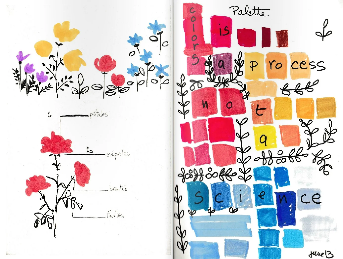 Here is the result ... I deleted the pages of scribbles, or idea for future books (I keep them for myself for the moment). I kept in the virtual version a page of Le Bu (7), who sometimes forgets his notebook and absolutely needs to draw a spaceship. Above all, as this is not my usual paper, I found myself with my markers ink bleeding through the paper ... At first it annoyed me terribly, and then I found markers that bled and others not. If you look for it, you will see that some designs are actually the result of the bleeding of the previous page, reworked. I ended up playing with it, and as I had a lot of fun, I will continue. It's the silver lining notebook.