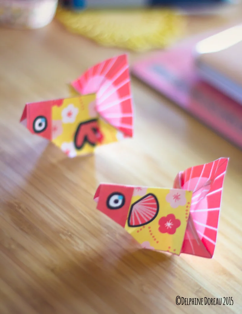 J'ai voulu créer pour vous un nouveau modèle de poisson , différent de celui d'Origami pour la Récré. Il le fallait, parce que ceux de mon livre ont besoin d'être imprimés des deux cotés. Vous avez déjà essayé d'imprimer des deux cotés sur une imprimante de salon? C'est presque impossible de tout bien caler!