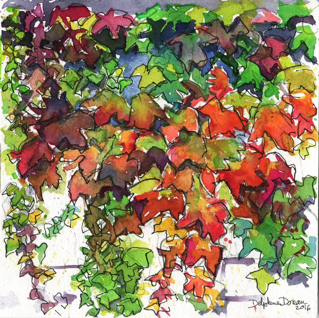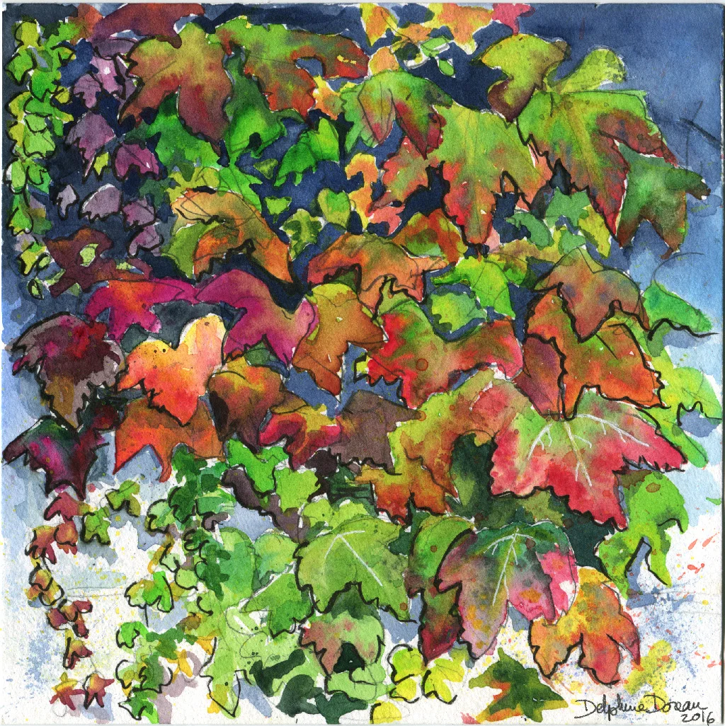 Ah mais c'était bien difficile cette fois-ci! Mon amie Amélie Aby , illustratrice surdouée que vous pouvez suivre sur Instagram , m'a envoyé de Normandie, en France donc, l'image d'un mur de vigne vierge (Parthenocissus tricuspidata) ...whoa! J'ai failli jeter l'éponge, je n'ai pas encore le niveau, clairement, pour quelque chose d'aussi détaillé et multicolore. Mais je n'ai pas pu resister, c'est si joli, alors je me suis lancée tout de même!
