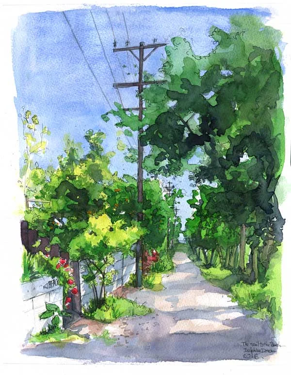 So Ok, the structure is better, but the colors were ugly. UGLY! I changed them into Photoshop. It was really ugly. I managed to use very bright out of the tube colors without thinking about what would be pretty in the end. Just because the sun is very bright here isn't an excuse to overdose on opera rose and sap green. Even if it's an exact rendering. But I quite like the light and the structure.