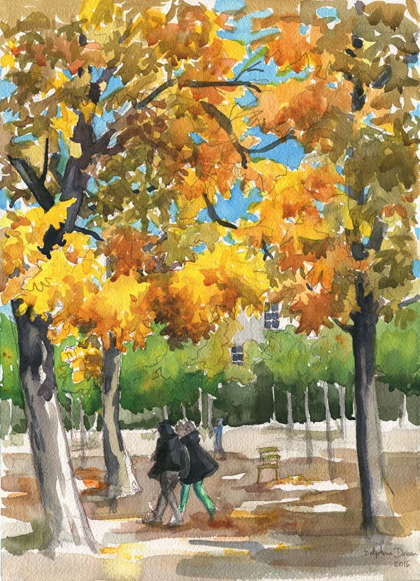 This painting I made from a photo that my friend Angel sent me from paris, France. It's the Luxembourg, a parc in Paris, my favorite actually. I really tried to get the autumn ambiance here, the same as the one 20 years ago when I was on this exact trail, walking to art school. I painted the watercolor, scanned it in high resolution, and touched up the colors to make it perfect. You can buy it here at society6 , and I encourage you to do it : all the money I make from my prints these days will be used to buy a print for my friend who sent me the photo (and if I make more, to buy more watercolor paint).