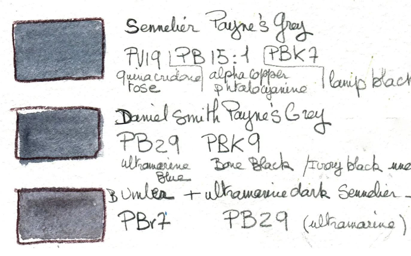 -Sennelier: their Payne's grey is a mix of PV19 PB15:1 PBk7 , codes for Quinacridone Violet, Phthalocyanine Blue Red Shade,Lamp black. Once again, magenta, a blue, and a black that goes on yellow.