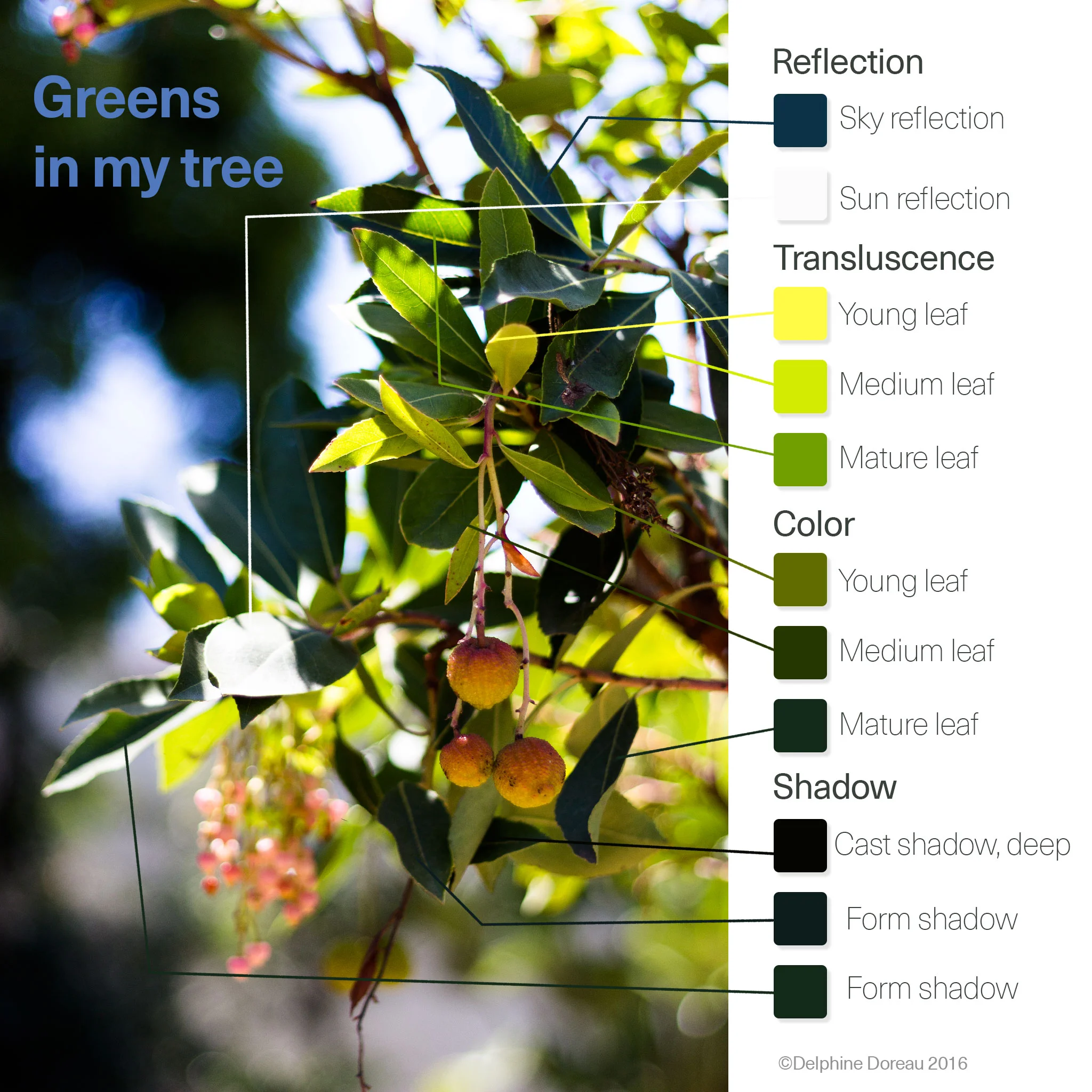 The colors you see are one extracted from an arbutus, taken on a sunny day in California. Colors change from tree to tree. I was wondering if colors would change with different latitudes, and yes , they do. I took two pictures I took at a week difference, one in LA, one in Toronto, of trees of a medium green, early afternoon, and did some color analysis on my iPad with the Colorotate app