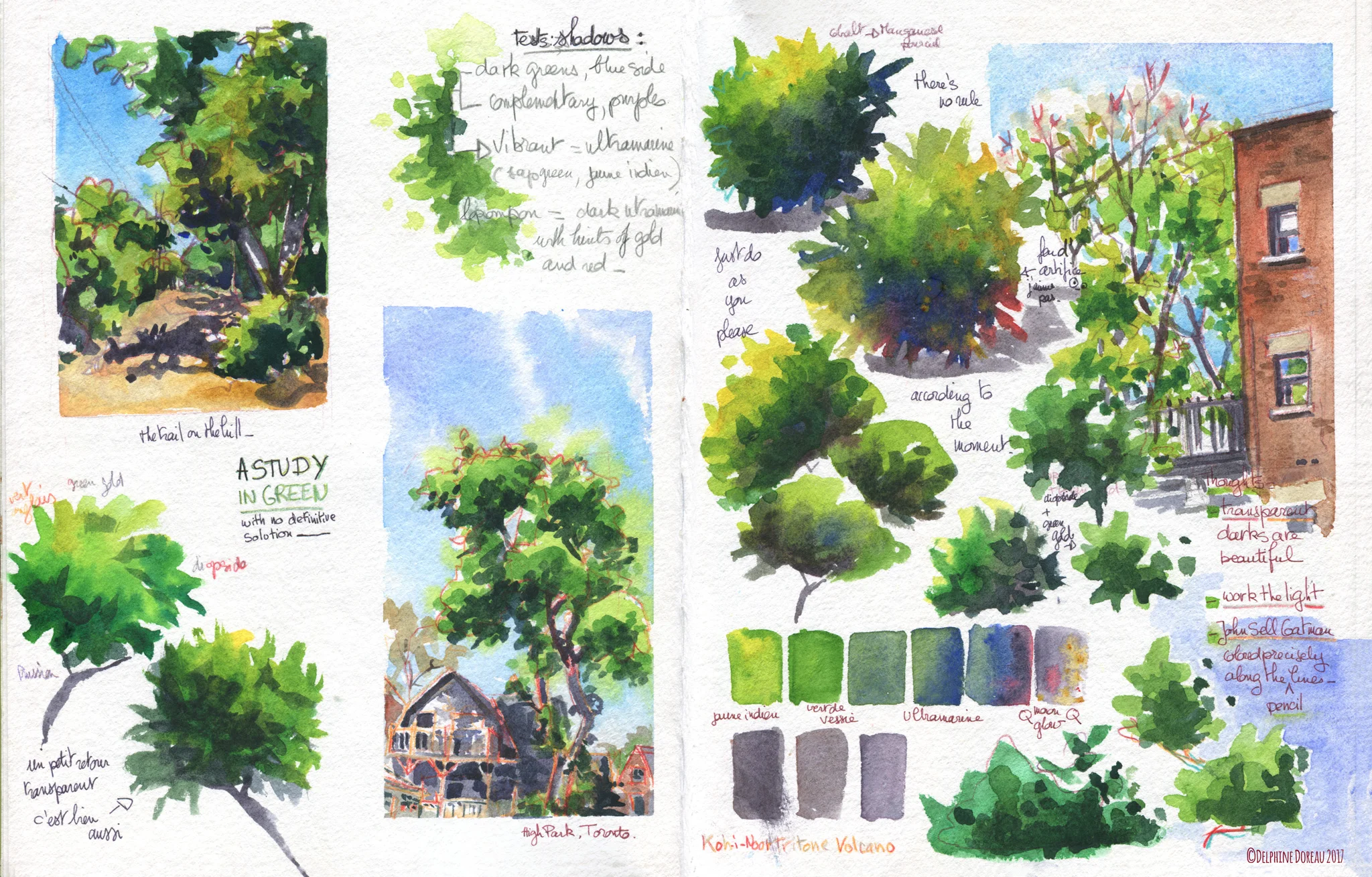 And then I tried to use this new color palette with family of colors in mind. I know that you can mix pretty much all watercolor paints together, with some exceptions (Cobalt Teal Blue for example, doesn't mix well with non-cobalt blues), but I also noticed that color mixes can go a little bit muddy, depending of the mix. Now most of the time I think it's due to the paper if I can't get the vivid transparency I like in layered colors, but I wondered if by using color Families instead of the one I liked in the moment it would work better. It does work better! Mixing phthalo greens and blues with the appropriate yellows does give a more vivid composition. It's not a strict rule : I also noticed that the Daniel Smith's Primatek greens that I own mix pleasantly with each other, and they all are different monopigments colors.