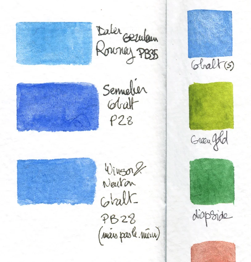I made tests : Prussian blue is too dark and green and not enough saturated, phthalo is too green and too intense, ultramarine is nice as a touch but a bit too dark and purple...this, for the not obviously, classic historical pigments that are lightfast and easy to find. I tend to prefer non toxic pigments or not too toxic paints because my cat loves to drink my paint water. She also is very fond of napping in my palette, something I can't really understand. You probably have to be a cat to find sitting in sticky paint comfortable. I also look for paints with only one pigments at first when building my palette. For exemple, I quite like Verditer blue from Daniel Smith, but it's made of 3 pigments including a gouache-ey white, a lovely color but probably not the best building block for a restricted palette. So I continued my search for nice paint made from possibly only one pigment with a historical background.
