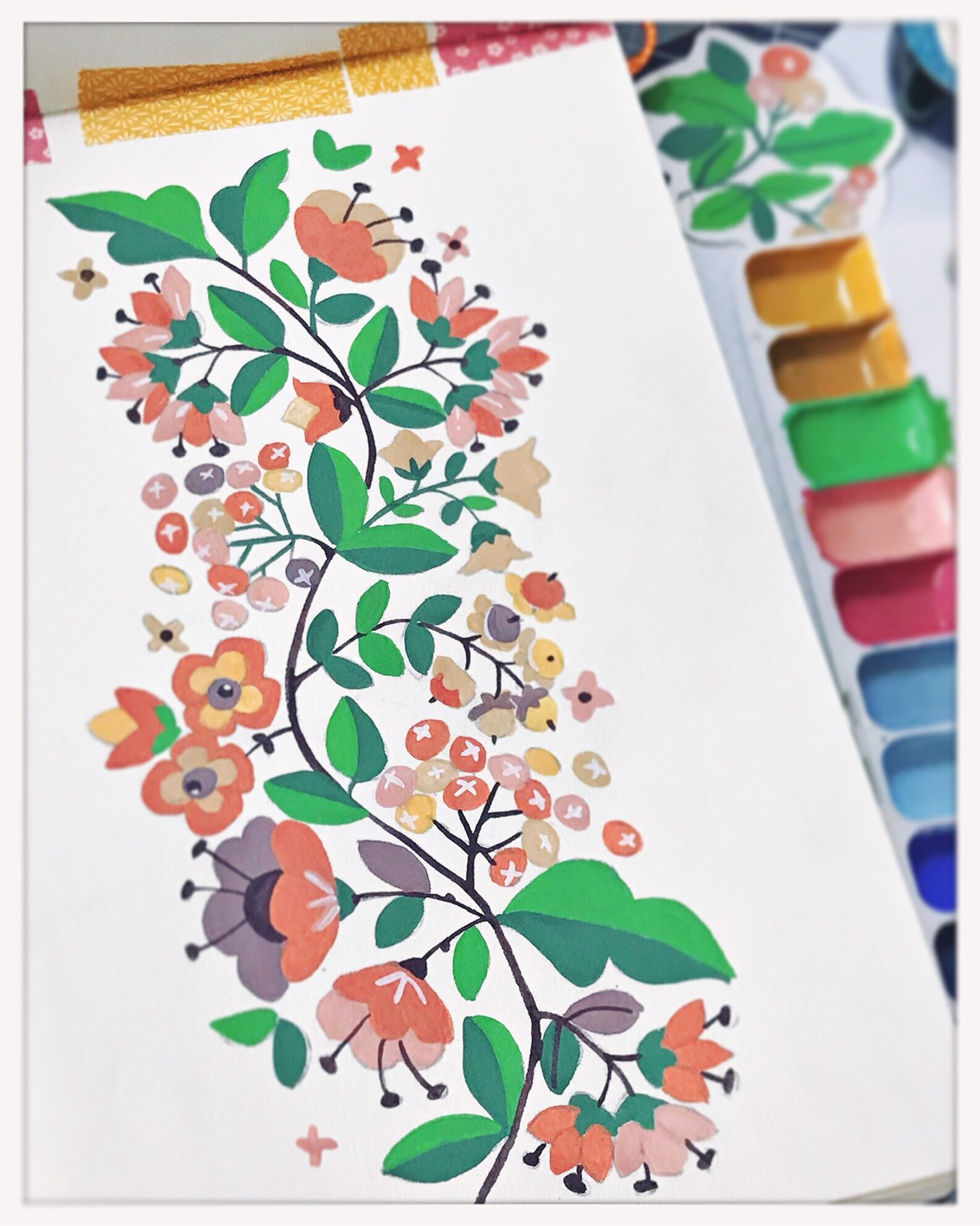 I went back to gouache mostly to play with colours. These days I'm working on the intersection of cultural colours with colours as products, a vast subject. I'll talk about in in another post. For my research I needed a large array of pigments and colours. I couldn't buy all the colours I wanted in yet another medium, so I decided to go with what I had in stock. Browsing my shelves I found: gouaches in little cakes I bought for my son, cheap but pretty watercolours untouched because they were muddied with white (horror) or too opaque (lots of cadmiums and other somewhat toxic colours that I put aside but can be used with proper care), some Irodori Holbein traditional Japanese watercolours which are really nice but very opaque (so much pigment!), and some tubes of gouache from different brands, the most lovely being the most scarce in my stash, beautiful Fine Gouache from Holbein. Thinking about it, I'm really fond of Holbein products and wish they were more readily available in Europe.
