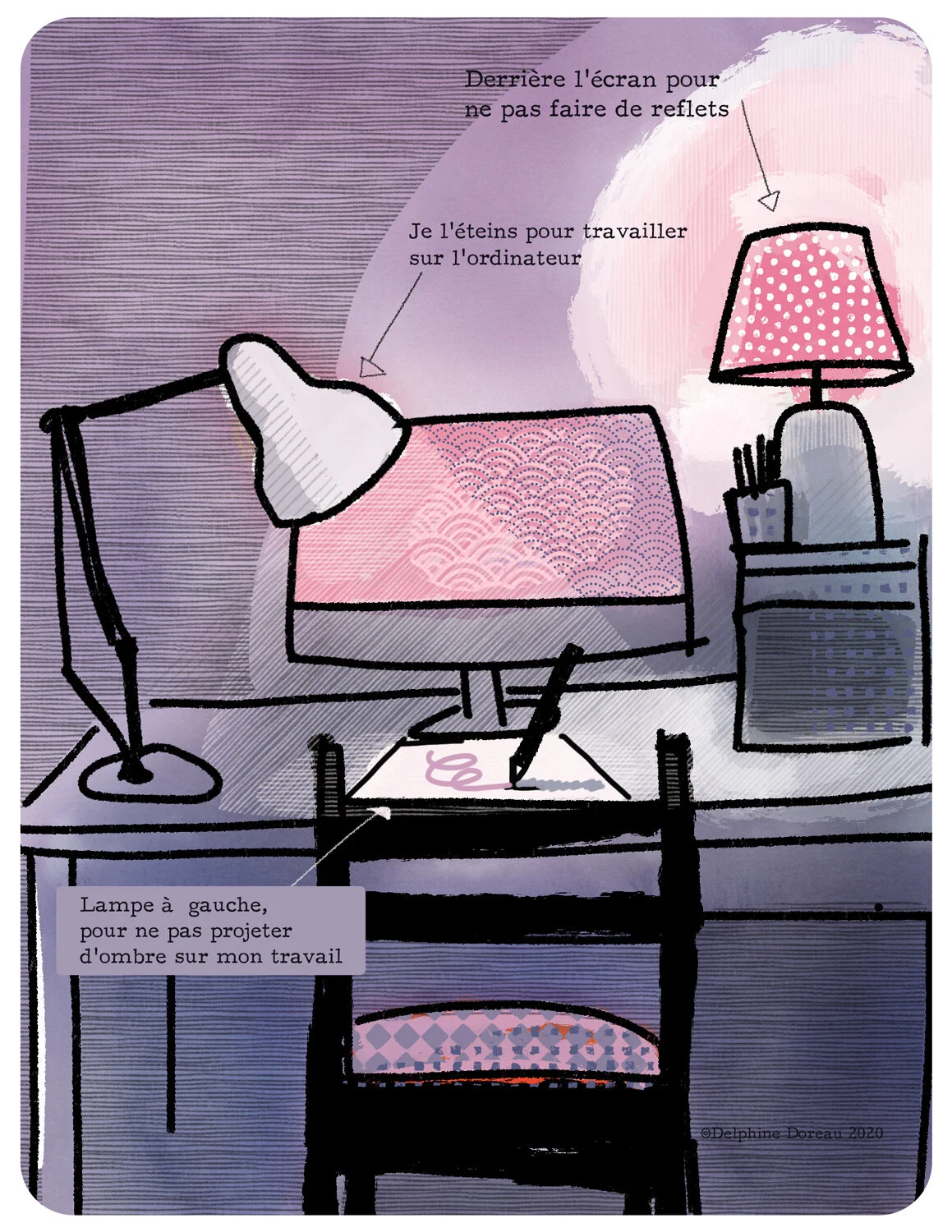 j’ai deux lampes sur mon bureau. D’abord une lampe d’architecte à gauche pour écrire et dessiner, l’ombre n’est pas sur mon dessin. Et une à droite, un peu moins forte, pour casser les ombres, et éclairer mon plan de travail quand je travaille avec mes deux mains. Il y a des bonnes lampes de travail sur tous les bureaux dans la maison.