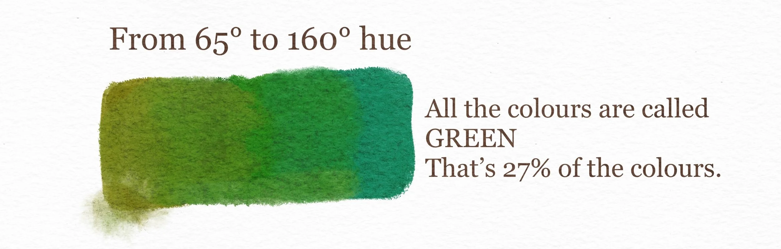I mean, you will mostly get greens if you mix yellow pigments and blue. And there’s tons of green pigments too. What we call green is a length wave, usually anything between 495 and 570 nanometers. So something between 60+ and 160º on a hue scale. There’s 360º of colour hues, it’s about a third of the visible range. That’s a lot.